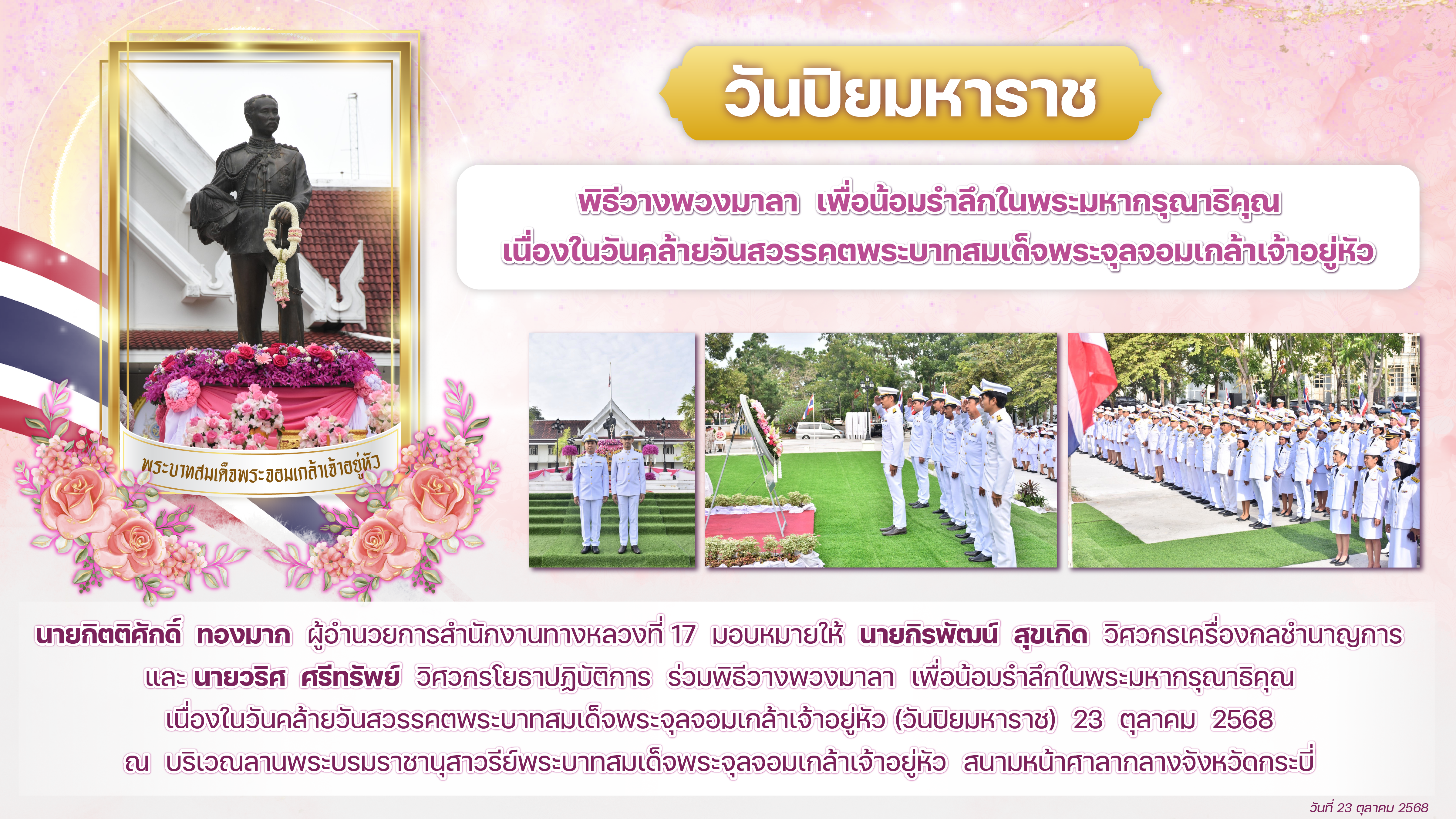 วันปิยมหาราช พิธีวางพวงมาลา เพื่อน้อมรำลึกในพระมหากรุณาธิคุณ เนื่องในวันคล้ายวันสวรรคตพระบาทสมเด็จพระจุลจอมเกล้าเจ้าอยู่หัว วันที่ 23 ตุลาคม 2568