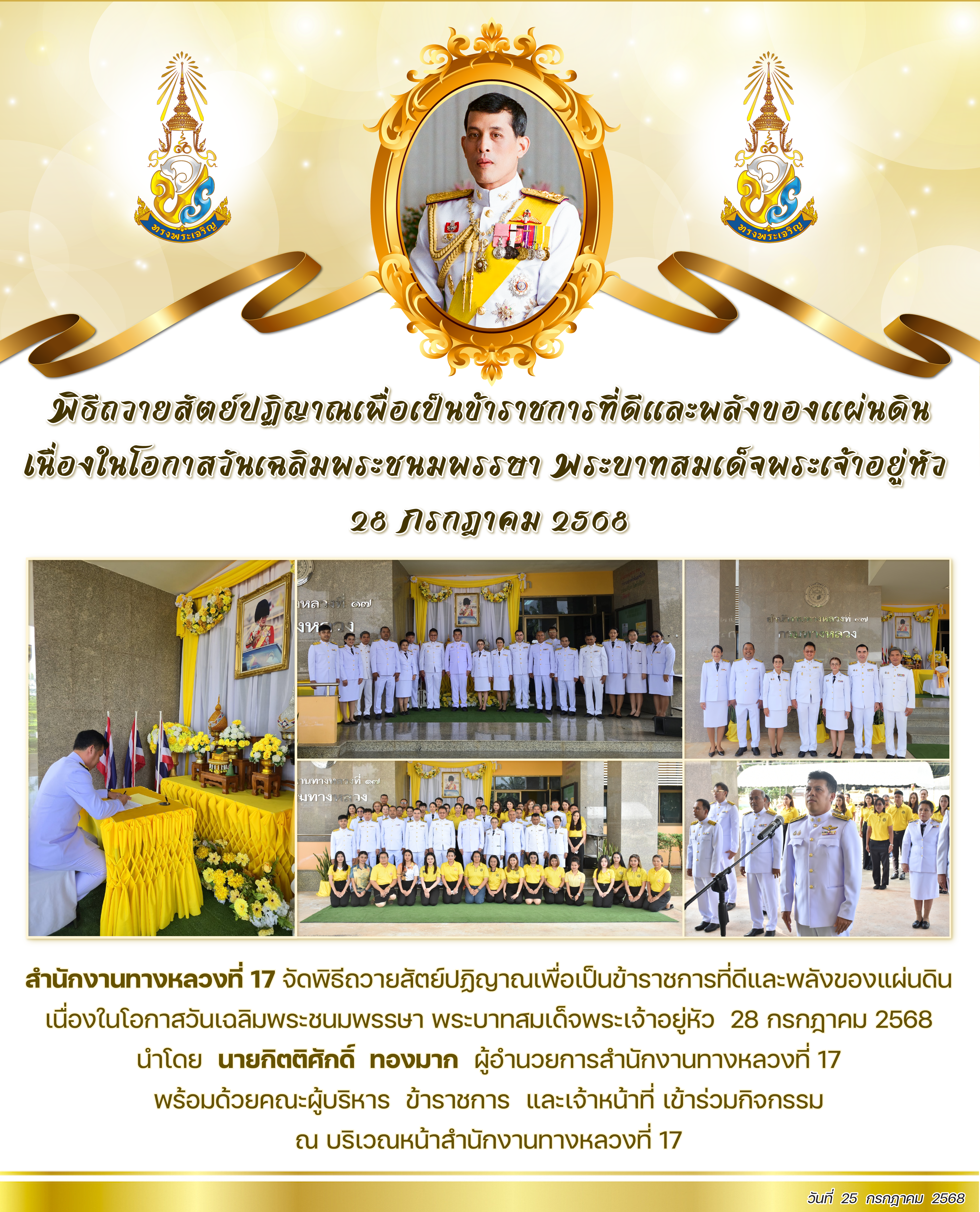 พิธีถวายสัตย์ปฏิญาณเพื่อเป็นข้าราชการที่ดีและพลังของแผ่นดิน เนื่องในโอกาสวันเฉลิมพระชนมพรรษา พระบาทสมเด็จพระเจ้าอยู่หัว 28 กรกฎาคม 2568