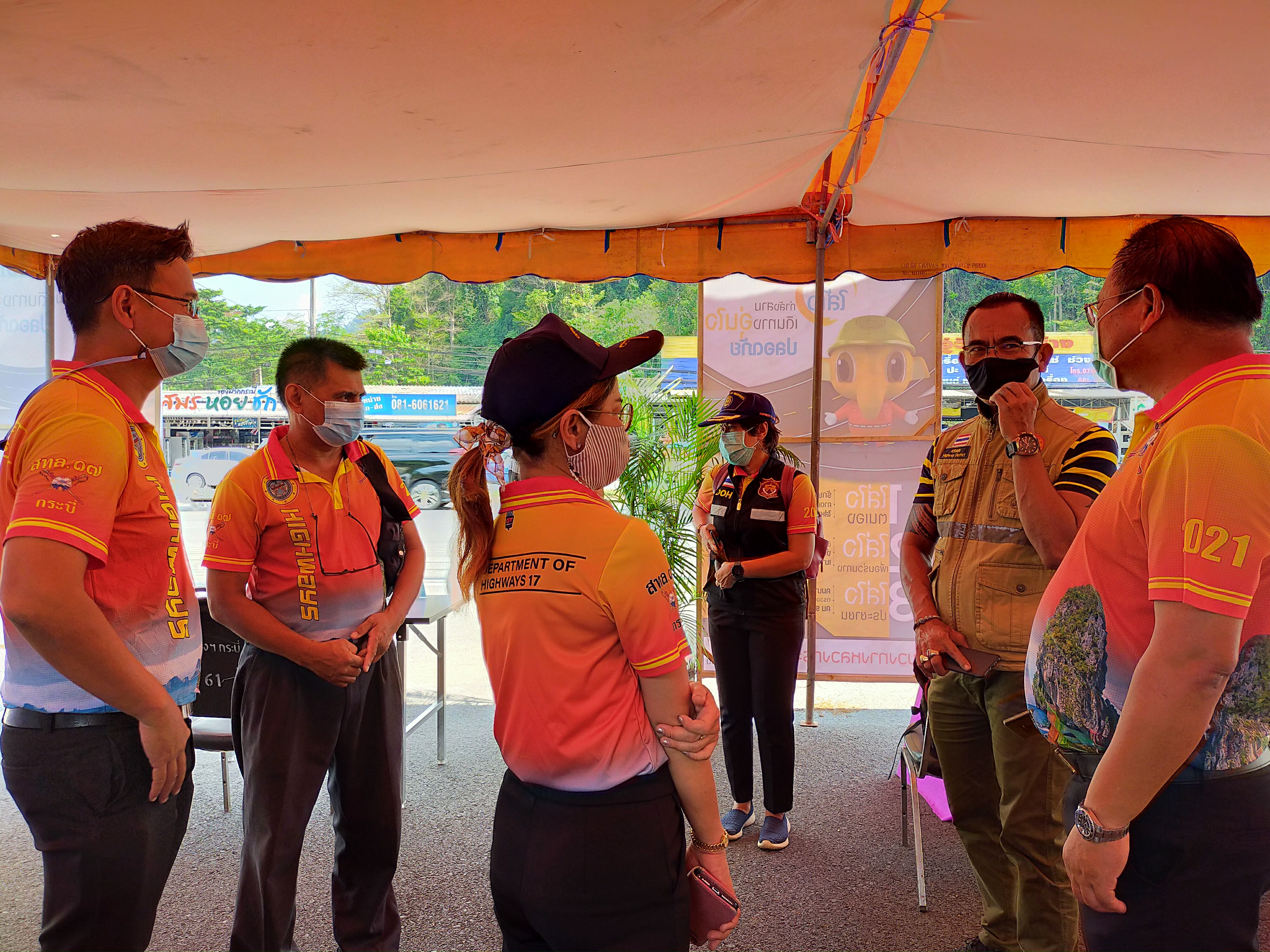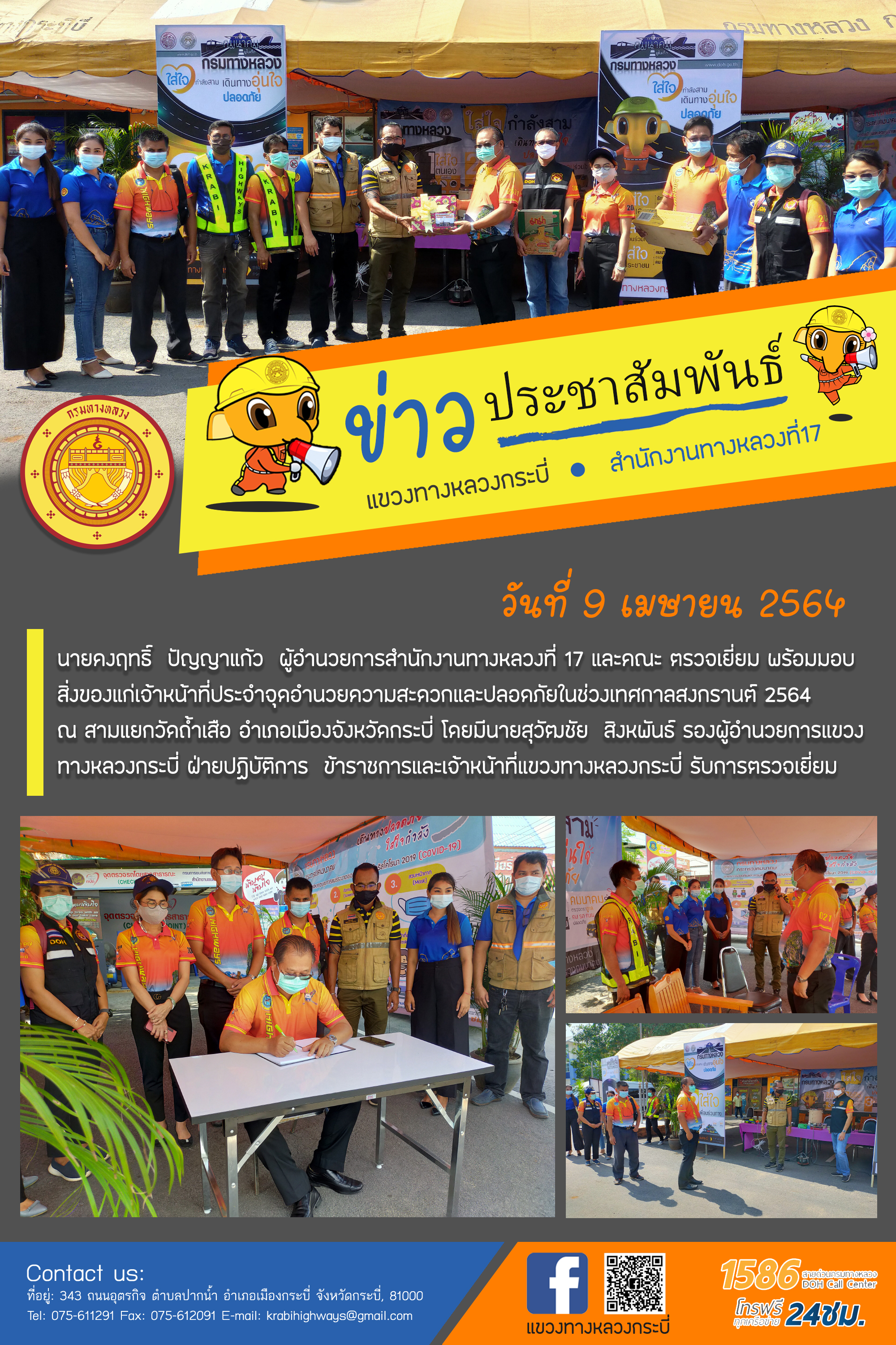 วันที่ 9 เมษายน 2564 เวลา 9.00 น. นายคงฤทธิ์ ปัญญาแก้ว ผู้อำนวยการสำนักงานทางหลวงที่ 17 และคณะ ตรวจเยี่ยมพร้อมมอบสิ่งของแก่เจ้าหน้าที่ประจำจุดอำนวยความสะดวกและปลอดภัยในช่วงเทศกาลสงกรานต์ 2564 ณ สามแยกวัดถ้ำเสือ อำเภอเมืองจังหวัดกระบี่ โดยมี นายสุวัฒชัย สิงหพันธ์ รองผู้อำนวยการแขวง ทางหลวงกระบี่ ฝ่ายปฏิบัติการ ข้าราชการและเจ้าหน้าที่แขวงทางหลวงกระบี่ รับการตรวจเยี่ยม