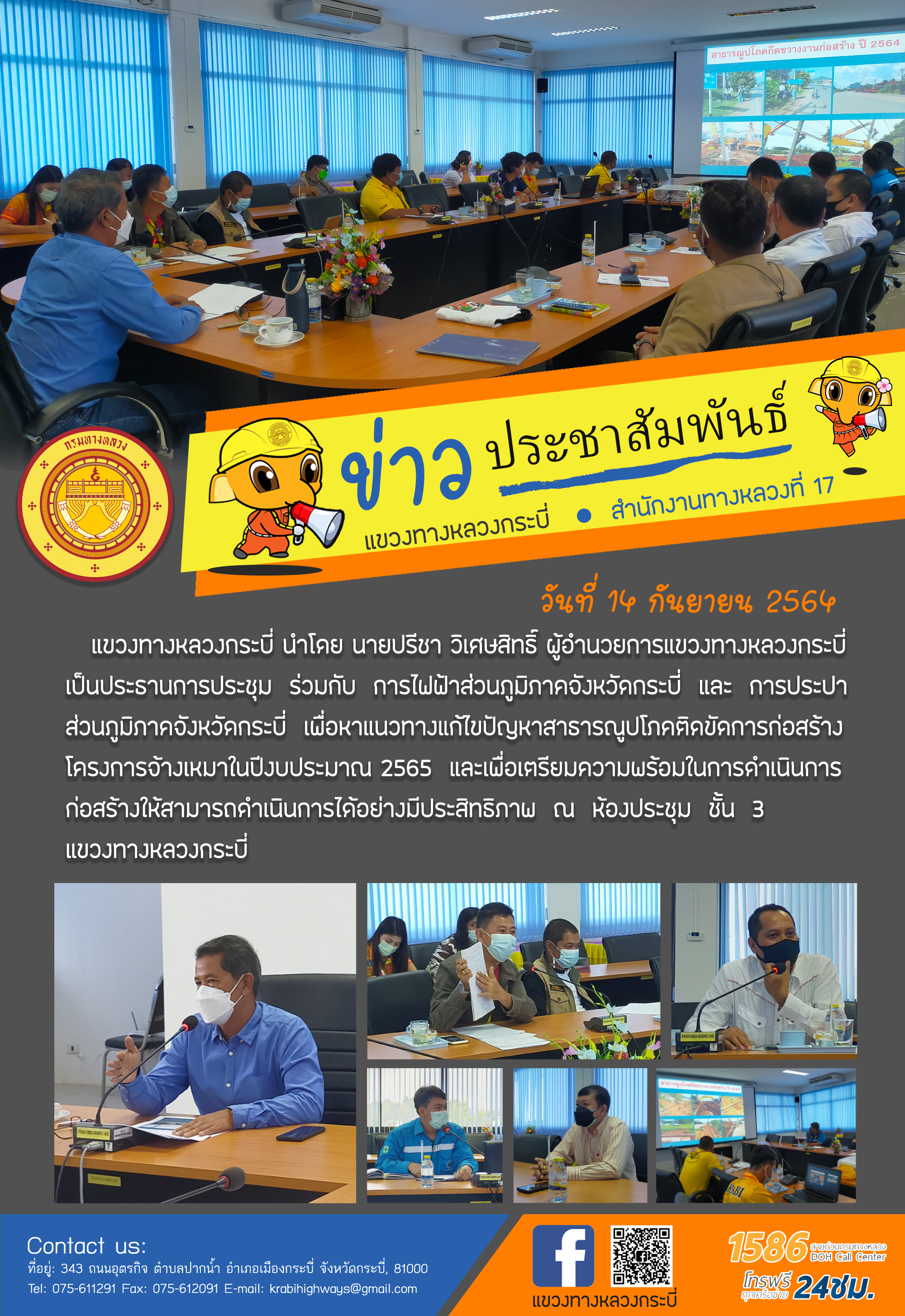 วันที่ 14 กันยายน 2564 เวลา 10.00 น. แขวงทางหลวงกระบี่ นำโดย นายปรีชา วิเศษสิทธิ์ ผู้อำนวยการแขวงทางหลวงกระบี่ เป็นประธานการประชุม ร่วมกับ การไฟฟ้าส่วนภูมิภาคจังหวัดกระบี่ และ การประปาส่วนภูมิภาคจังหวัดกระบี่ เพื่อหาแนวทางแก้ไขปัญหาสาธารณูปโภคติดขัดการก่อสร้าง โครงการจ้างเหมาในปีงบประมาณ 2565 และเพื่อเตรียมความพร้อมในการดำเนินการก่อสร้างให้สามารถดำเนินการได้อย่างมีประสิทธิภาพ ณ ห้องประชุม ชั้น 3 แขวงทางหลวงกระบี่