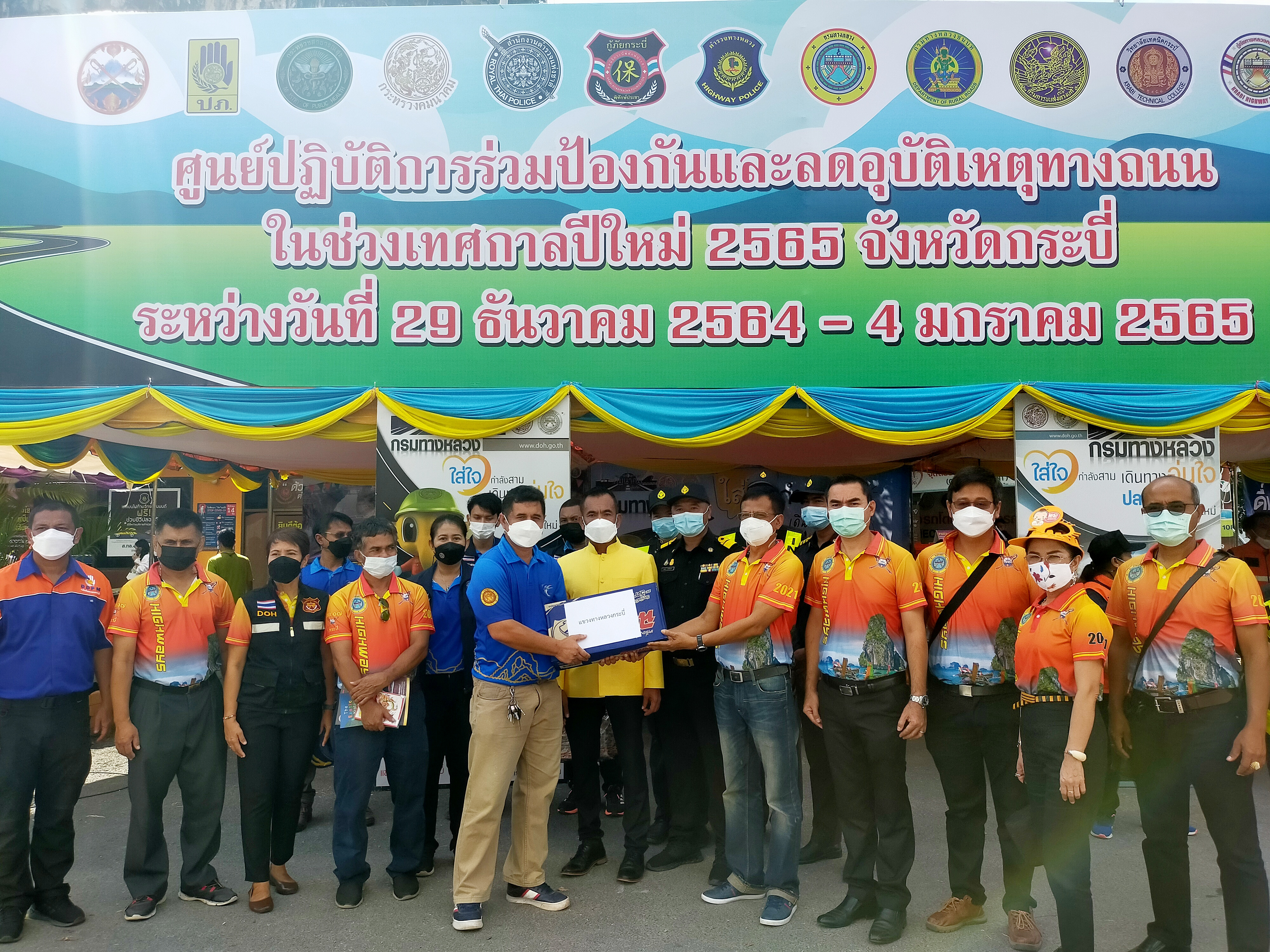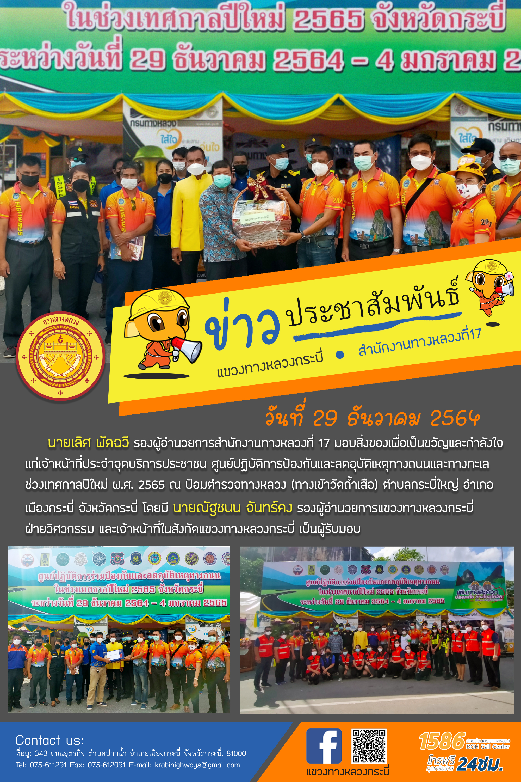 วันที่ 29 ธันวาคม 2564 เวลา 10.00 น. นายเลิศ พัดฉวี รองผู้อำนวยการสำนักงานทางหลวงที่ 17 มอบสิ่งของเพื่อเป็นขวัญและกำลังใจแก่เจ้าหน้าที่ประจำจุดบริการประชาชน ศูนย์ปฏิบัติการป้องกันและลดอุบัติเหตุทางถนนและทางทะเลช่วงเทศกาลปีใหม่ พ.ศ. 2565 ณ ป้อมตำรวจทางหลวง (ทางเข้าวัดถ้ำเสือ) ตำบลกระบี่ใหญ่ อำเภอเมือง จังหวัดกระบี่ โดยมี นายณัฐชนน จันทร์คง รองผู้อำนวยการแขวงทางหลวงกระบี่ ฝ่ายวิศวกรรม และเจ้าหน้าที่ในสังกัดแขวงทางหลวงกระบี่ เป็นผู้รับมอบ