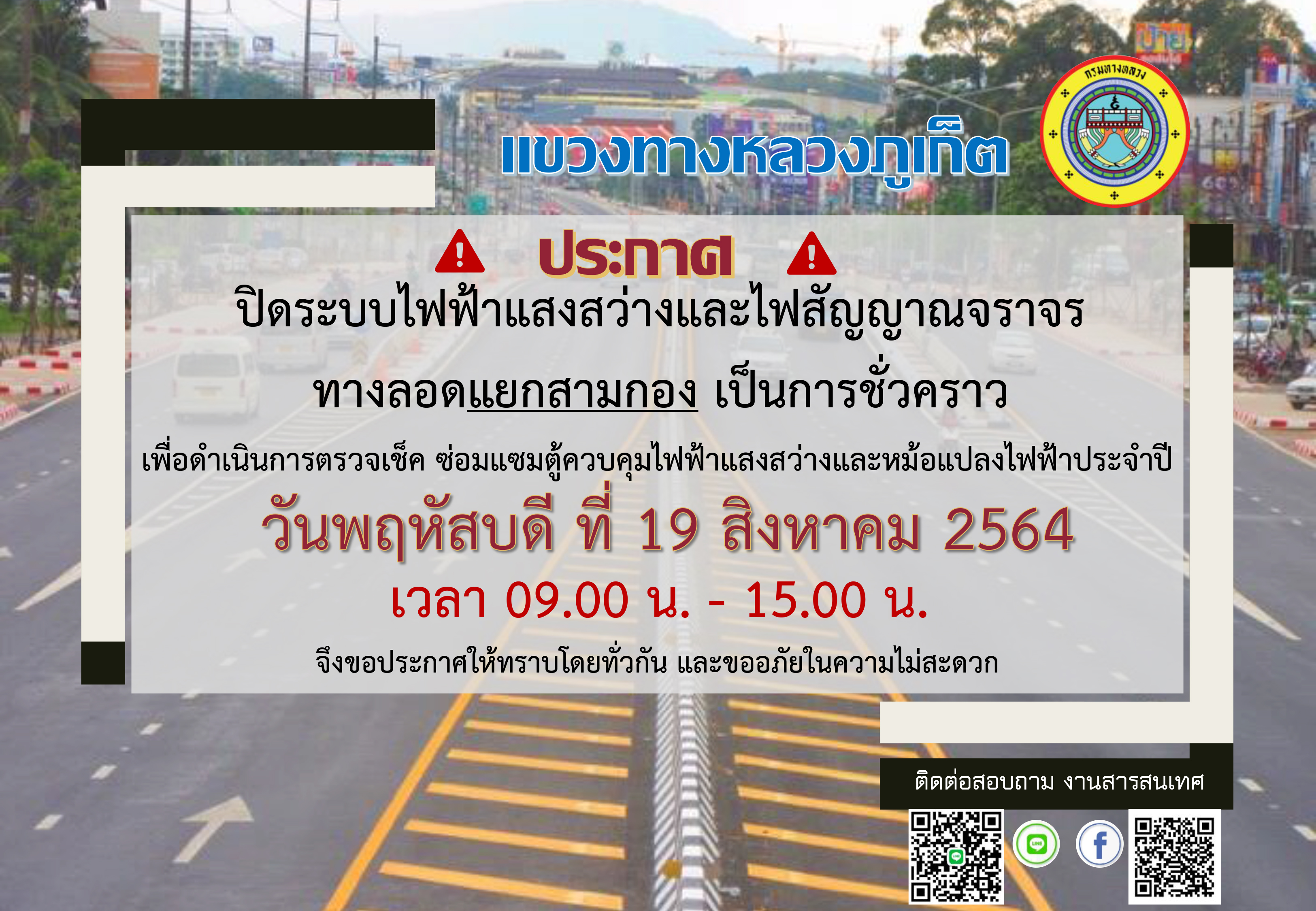 ประกาศ!! ปิดระบบไฟฟ้าแสงสว่างและไฟสัญญาณจราจร บริเวณทางลอดสามกองชั่วคราว!!!! วันที่ 19 สิงหาคม 2564