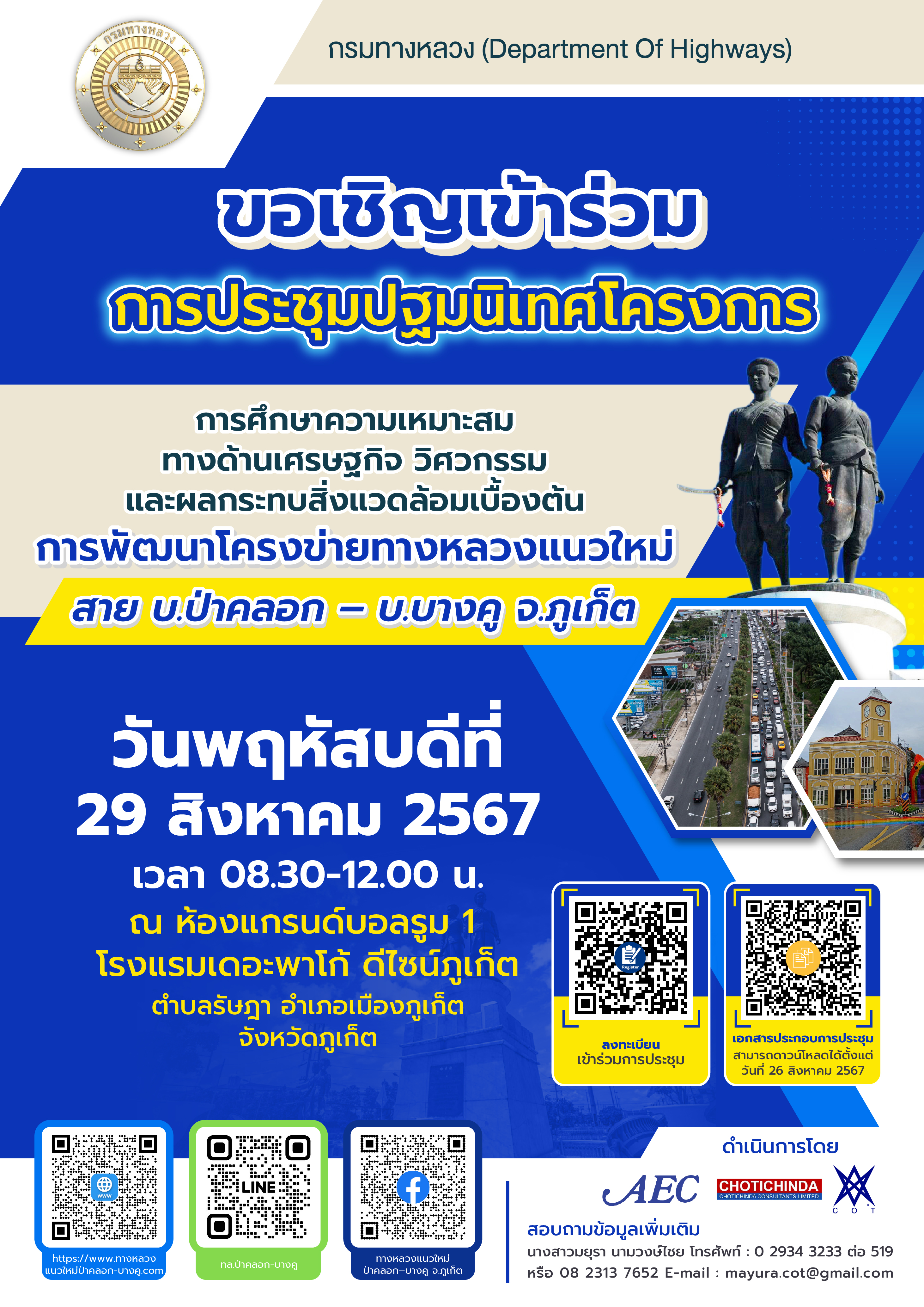 ขอเชิญเข้าร่วมการประชุมปฐมนิเทศโครงการ การศึกษาความเหมาะสมทางด้านเศรษฐกิจ วิศวกรรม และผลกระทบสิ่งแวดล้อมเบื้องต้น การพัฒนาโครงข่ายทางหลวงแนวใหม่ สาย บ.ป่าคลอก – บ.บางคู จ.ภูเก็ต เพื่อให้ประชาชน หน่วยงาน และองค์กรระดับต่าง ๆ รับทราบถึงความเป็นมา วัตถุประสงค์ ขอบเขตการศึกษา และประโยชน์ที่คาดว่าจะได้รับจากการพัฒนาโครงการ ตลอดจนรับฟังความคิดเห็นและข้อเสนอแนะอันจะเป็นประโยชน์ต่อการนำไปประกอบการศึกษาให้เหมาะสมสอดคล้องกับความต้องการของคนในพื้นที่