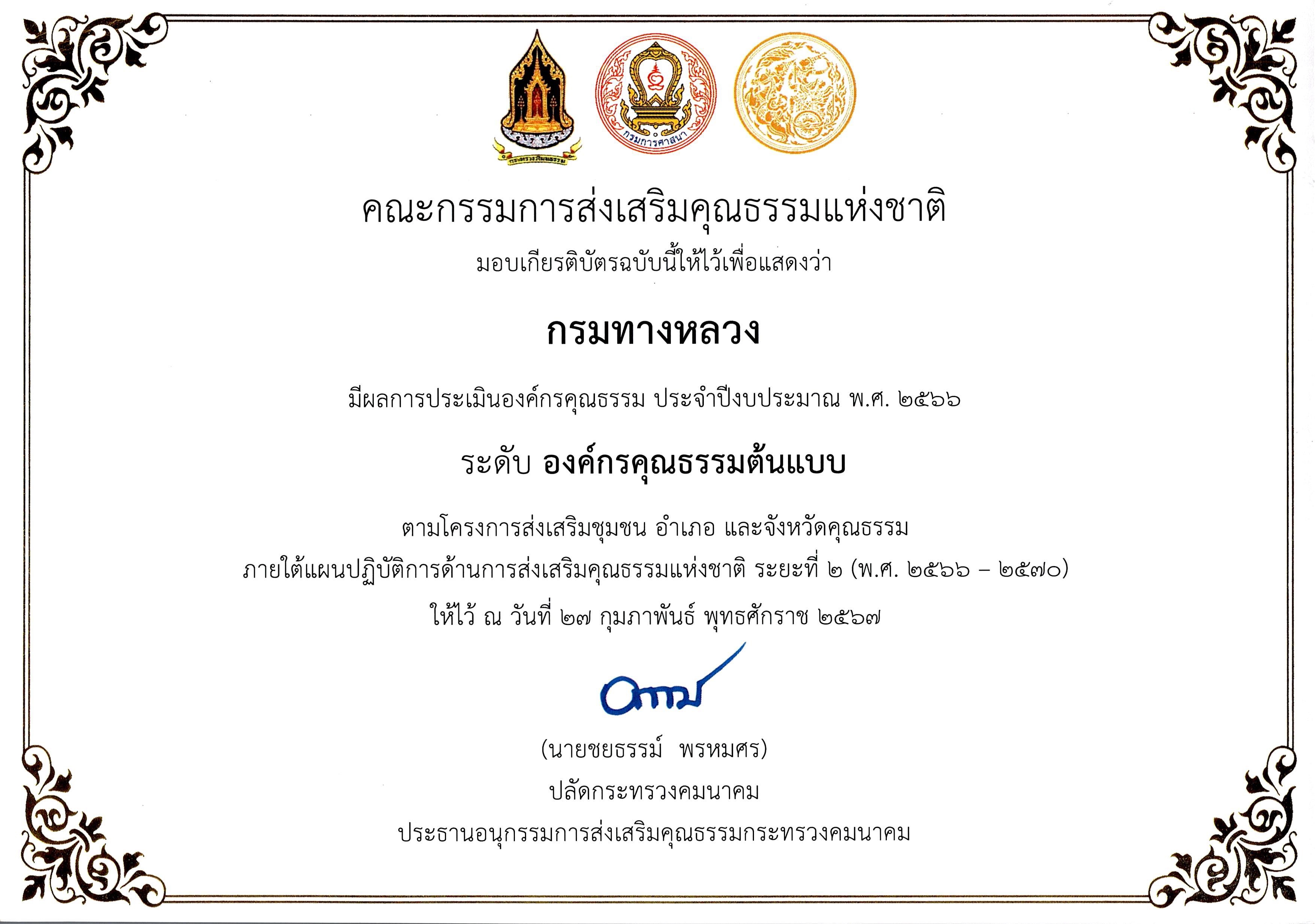 87 28/02/2567 กรมทางหลวงได้รับการประเมินองค์กรคุณธรรม ประจำปีงบประมาณ 2566 ในระดับ “คุณธรรมต้นแบบ”