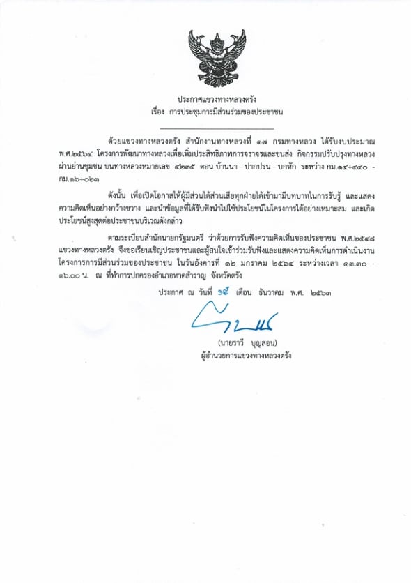 โครงการพัฒนาทางหลวงเพื่อเพิ่มประสิทธิภาพการจราจรและขนส่ง กิจกรรมปรับปรุงทางหลวงผ่านย่านชุมชน ทางหลวงหมายเลข 4235 ตอน บ้านนา - ปากปรน - บกหัก ระหว่าง กม.14+440 - กม.16+023