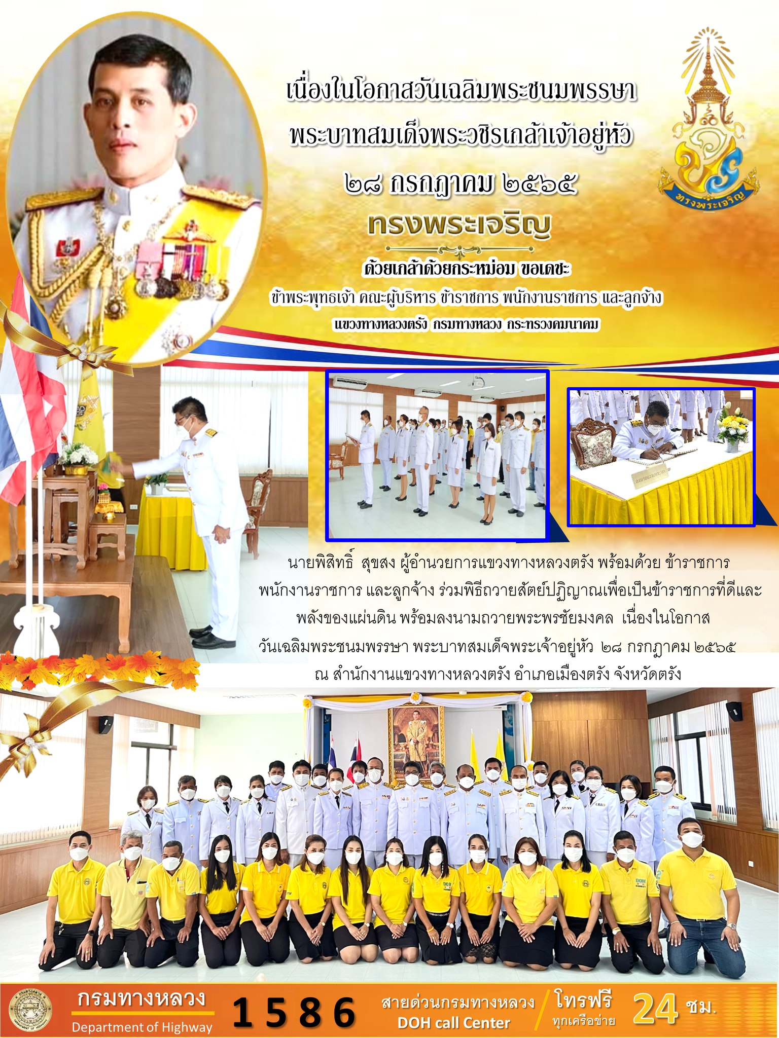 นายพิสิทธิ์ สุขสง ผู้อำนวยการแขวงทางหลวงตรัง พร้อมด้วยข้าราชการ พนักงานและลูกจ้าง ร่วมพิธีถวายสัตย์ปฏิญาณเพื่อเป็นข้าราชการที่ดีและพลังของแผ่นดิน พร้อมลงนามถวายพระพรชัยมงคล เนื่องในโอกาสวันเฉลิมพระชนมพรรษา พระบาทสมเด็จพระเจ้าอยู่หัว 28 กรกฎาคม 2565 เพื่อปฏิบัติหน้าที่ตามรอยพระยุคลบาทในฐานะข้าของแผ่นดินให้เกิดประโยชน์สุขแก่ประชาชนและประเทศชาติสืบไป ณ สำนักงานแขวงทางหลวงตรัง อำเภอเมืองตรัง จังหวัดตรัง